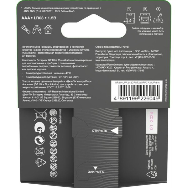 Китай Характеристики: 1,5 В; Типоразмер ААА, LR03 Номинальная емкость: 1700 мАч 2 шт. в картонном блистере