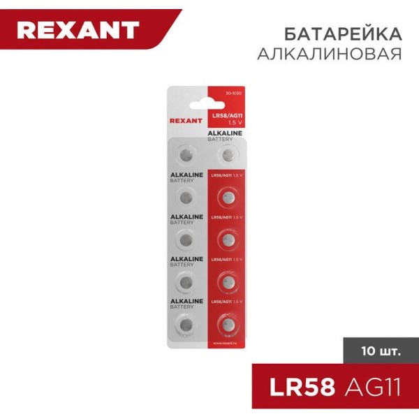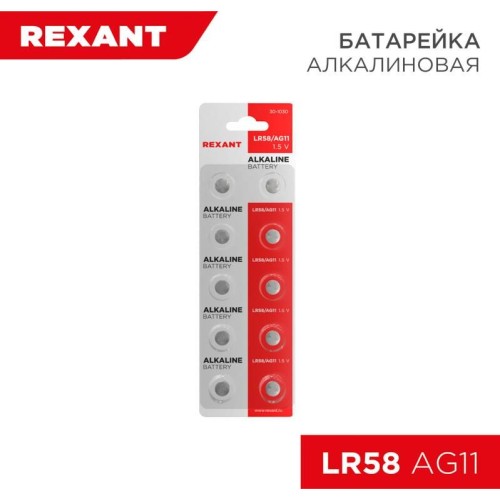 Батарейки REXANT (30-1030) LR58, 1,5В, 10 шт (AG11, LR721, G11, 162, GP62A, 362, SR721W) блистер