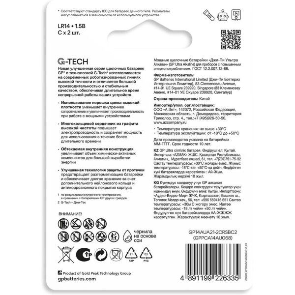 Алкалиновые батарейки GP Ultra Alkaline G-Tech 14А типоразмера C - 2 шт. на блистере