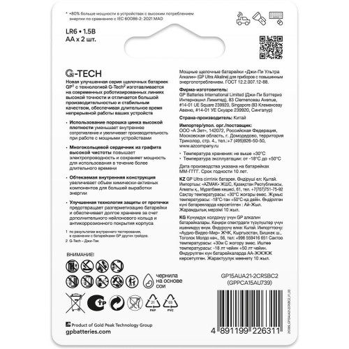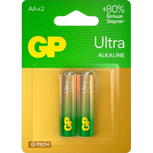 Алкалиновые батарейки GP Ultra Alkaline G-Tech 15А AA - 2 шт. на блистере