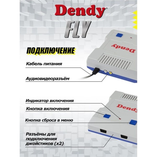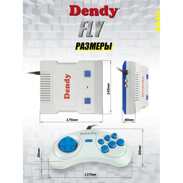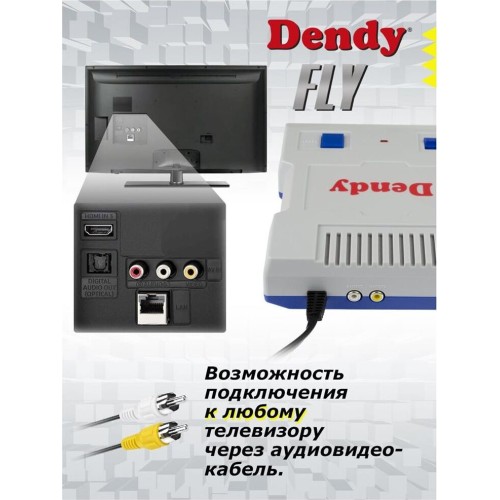 Оригинальные технические характеристики консоли, аутентичный звук и картинка! DENDY Fly — это компактная приставка, которая легко подключается, просто управляется и имеет большую подборку игр 8-бит. Полные версии известных и популярных игр от простых тетрисов и бродилок, увлекательных головоломок и лабиринтов до приключений и шутеров. Комплектация: 1. Игровая консоль - 1 шт. 2. Джойстики - 2 шт. 3. Кабель AV 2x2 RCA - 1 шт. 4. Инструкция по эксплуатации - 1 шт. Характеристики: ТОРГОВАЯ МАРКА Денди ТИП стационарная РАЗРЕШЕНИЕ 256*240 ВСТРОЕННЫЕ ИГРЫ 300 ВСТРОЕННАЯ ПАМЯТЬ 512 МБ ПРОЦЕССОР 8-битный 1,79 МГц ЗВУК моно ПИТАНИЕ внутренний блок питания РАЗМЕР КОНСОЛИ 145х175х35 мм ВЕС КОНСОЛИ 260 гр. РАЗЪЕМ ДЛЯ ПОДКЛЮЧЕНИЯ ДЖОЙСТИКОВ 2 шт.9 pin СОВМЕСТИМОСТЬ 8-бит Денди ПОДКЛЮЧЕНИЕ AV 2x2 RCA ЦВЕТ серый + синий ВЕС ДЖОЙСТИКА 89 гр. РАЗМЕР ДЖОЙСТИКА 13,7 см*6 см. ДЛИНА ВИДЕО КАБЕЛЯ 1,5 м ДЛИНА КАБЕЛЯ ДЖОЙСТИКА 1,5 м ДЛИНА СЕТЕВОГО КАБЕЛЯ 1,5 м УПАКОВКА картонная коробка СТРАНА ПРОИЗВОДСТВА Россия