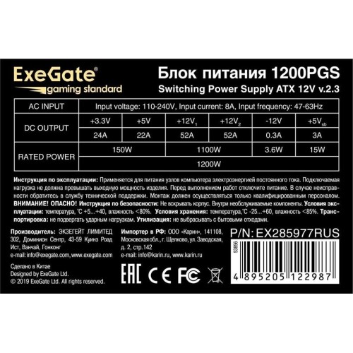 Exegate EX285977RUS Блок питания 1200W ExeGate Gaming Standard 1200PGS RTL, ATX, black, APFC, 14cm, 24p+2*(4+4)p, PCI-E, 5SATA, 4IDE