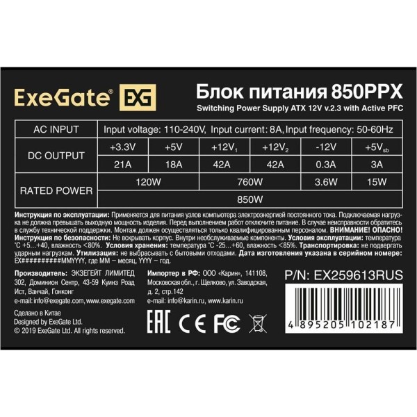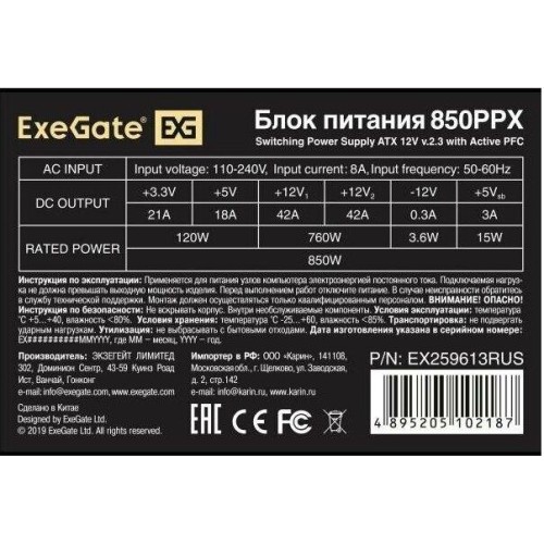 [Блок питания] Exegate EX259613RUS Блок питания 850W Exegate 850PPX RTL, ATX, black, APFC, 14cm, 24p+2*(4+4)p, PCI-E,4*IDE,5*SATA, FDD Exegate EX259613RUS Блок питания 850W Exegate 850PPX RTL, ATX, black, APFC, 14cm, 24p+2*(4+4)p, PCI-E,4*IDE,5*SATA, FDD высота(см) 9 длина(см) 20 масса(кг) 0.87 ширина(см) 15 Floppy 4-pin 1 GTD Number 10013160/110523/3212545/3 GTIN 04895205102187 IDE 4-pin 4 Cтрана-производитель китай Molex 4 + 4 pin 2 Партномер EX259613RUS SATA 5 Вес (грамм)