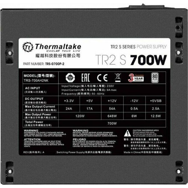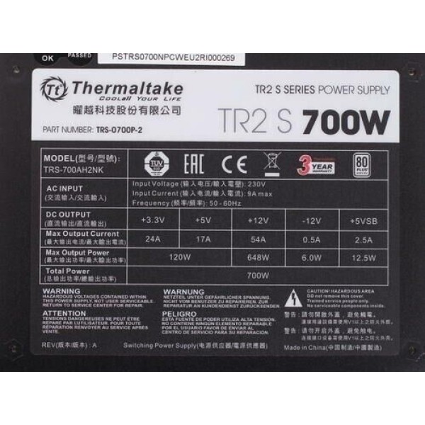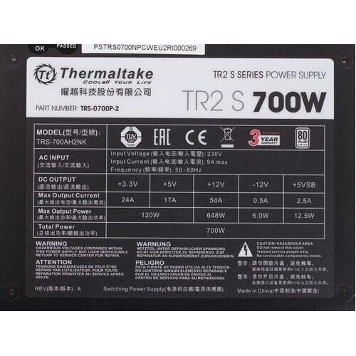 Основные параметры Бренд Thermaltake Модель TR2 S Стандарт ATX Цвет корпуса Черный Мощность 620-775 Вт Мощность 700 Вт Максимальная нагрузка (сила тока по линиям) Ток по линии +3.3 В - 24 A Ток по линии +5 В - 17 A Ток по линии +12 В 1 - 54 A Ток по линии -12 В - 0.5 A Ток по линии +5 В Standby - 2.5 A Производительность (КПД) н/д PFC Активный Уровень шума н/д Питание материнской платы 24+4+4 pin Длина кабеля питания материнской платы н/д Питание видеокарты 2 x 6+2 pin Разъемы