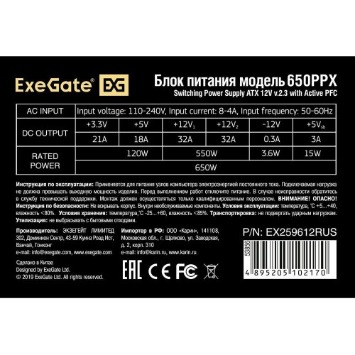 [Блок питания] Exegate EX259612RUS Блок питания 650W Exegate 650PPX RTL, ATX, black, APFC, 14cm, 24p+(4+4)p, PCI-E, 5SATA, 4IDE, FDD Exegate EX259612RUS Блок питания 650W Exegate 650PPX RTL, ATX, black, APFC, 14cm, 24p+(4+4)p, PCI-E, 5SATA, 4IDE, FDD масса(кг) 1.4 Floppy 4-pin 1 GTD Number 10013160/110523/3212545/3 GTIN 04895205102170 IDE 4-pin 4 Cтрана-производитель китай Molex 4-pin 1 Партномер EX259612RUS SATA 5 Вес (грамм) 850 Вес брутто (кг) 1.85 высота(см)