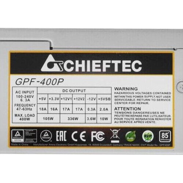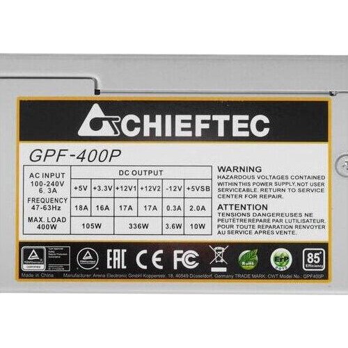 Форм-фактор: TFX; Цвет корпуса БП: Стандарт; Мощность: 400 Вт; Максимальная нагрузка (сила тока по линиям): Ток по линии +3.3 В 16 A, Ток по линии +5 В 18 A, Ток по линии +12 В 1 17 A, Ток по линии +12 В 2 17 A, Ток по линии -12 В 0.3 A, Ток по линии +5 В Standby 2 A; PFC: Активный; Разъемы питания материнской платы и процессора: 24+4+4 pin; Длина кабеля питания материнской платы: н/д; Разъемы Molex: 2 шт; Разъемы SATA: 4 шт; Разъемы для FDD: 1 шт; Прочие особенности и свойства: Защита от перенапряжения