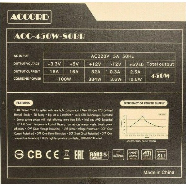 ACCORD Блок питания ATX 450W ACC-450W-80BR 80+ bronze (20+4pin) 120mm fan 6xSATA RTL