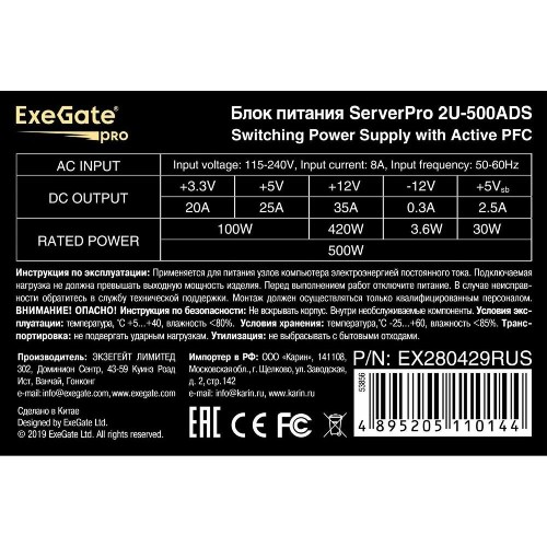 [Блок питания] Exegate EX280429RUS Серверный БП 500W ExeGate APFC, унив. для 2U, 24pin, 2*8pin, 5xSATA, 3xIDE Exegate EX280429RUS Серверный БП 500W ExeGate APFC, унив. для 2U, 24pin, 2*8pin, 5xSATA, 3xIDE масса(кг) 2 Floppy 4-pin 1 GTD Number 10013160/130323/3114658/2 GTIN 04895205110144 IDE 4-pin 3 Cтрана-производитель китай Molex 4-pin 1 MTBF 120 тыс. часов Партномер EX280429RUS SATA 5 Вес (грамм) 1580 Вес брутто (кг) 1.577 высота(см) 7 гарантия 1 год Длина кабеля (м) 0.37 длина(см)