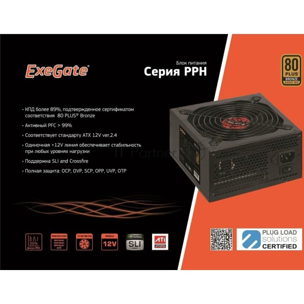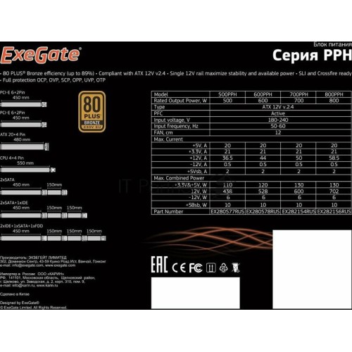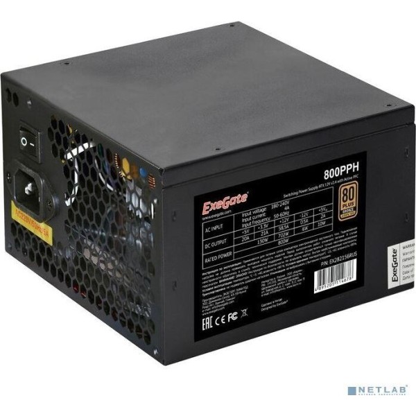 [Блок питания] Exegate EX282156RUS Блок питания 800W ExeGate 80 PLUS® Bronze 800PPH (ATX, APFC, КПД 89% (80 PLUS Bronze), 12cm fan, 20+4pin, 2x(4+4)pin, 4xPCI-E, 8xSATA, 4xIDE, black, Color Box)