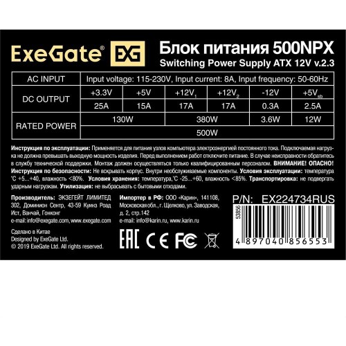 EXEGATE Блок питания 500NPX, 500Вт, 120мм, черный [ex224734rus]