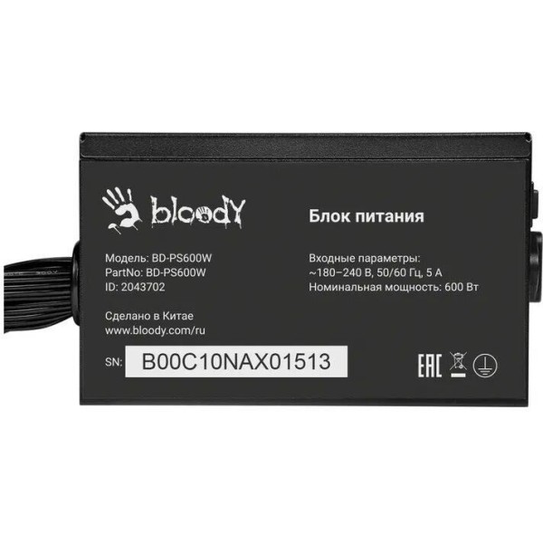 BLOODY Блок питания ATX 600W BD-PS600W 80 PLUS WHITE (20+4pin) APFC 120mm fan 6xSATA RTL
