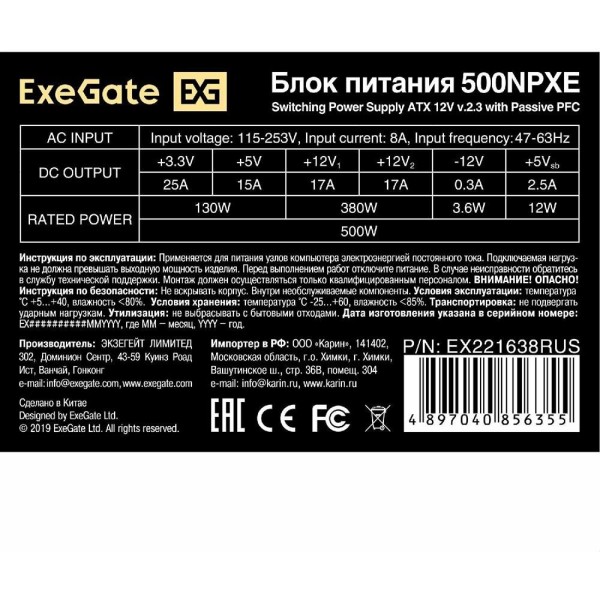 EXEGATE Блок питания 500NPXE, 500Вт, 120мм, черный [ex221638rus]