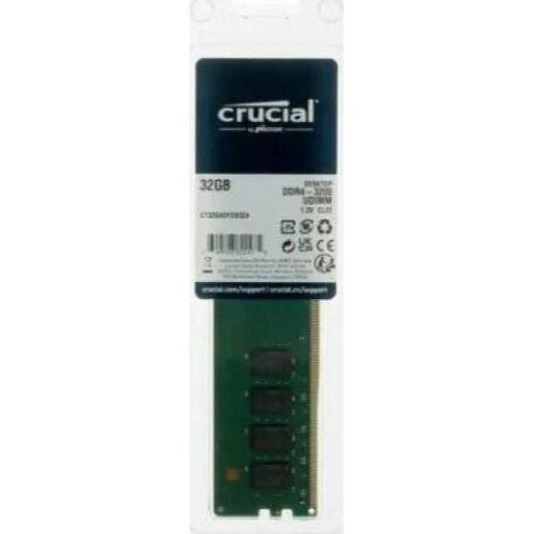 Название товара: Модуль оперативной памяти; Назначение: для компьютера; Количество модулей памяти в комплекте: 1; Тип модуля памяти: DDR4; Объём: 32Gb; Объем одного модуля памяти: 32Gb; Форм-фактор: UDIMM; Пропускная способность (Рабочая частота): PC4-25600 3200MHz; Особенности: NON-ECC, Unbuffered; Код вендора: CT32G4DFD832A; Тайминги: 22-22-22; Латентность: CL22; Питание: 1.2 В; Охлаждение: Нет; Профиль: XMP; Прочие особенности и свойства: н/д; Размеры, вес: н/д