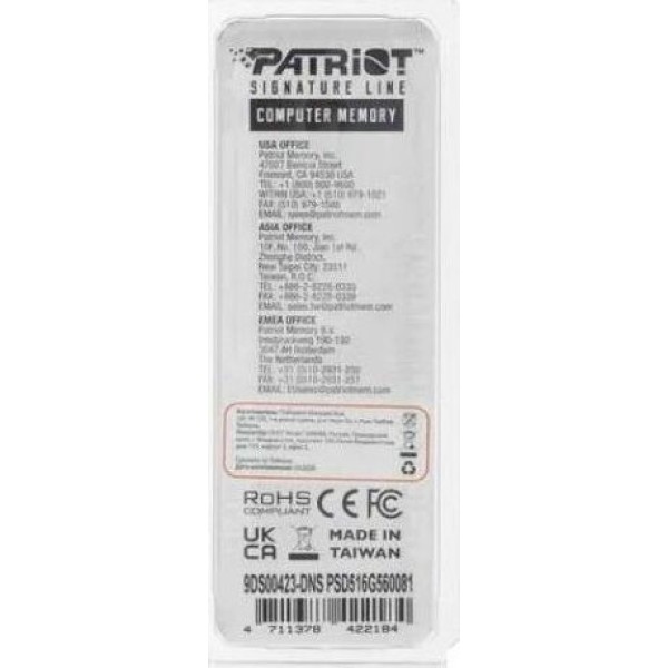 PATRIOT Память DDR5 16GB 5600MHz PSD516G560081 Signature RTL PC5-44800 CL46 DIMM 288-pin 1.1В single rank Ret