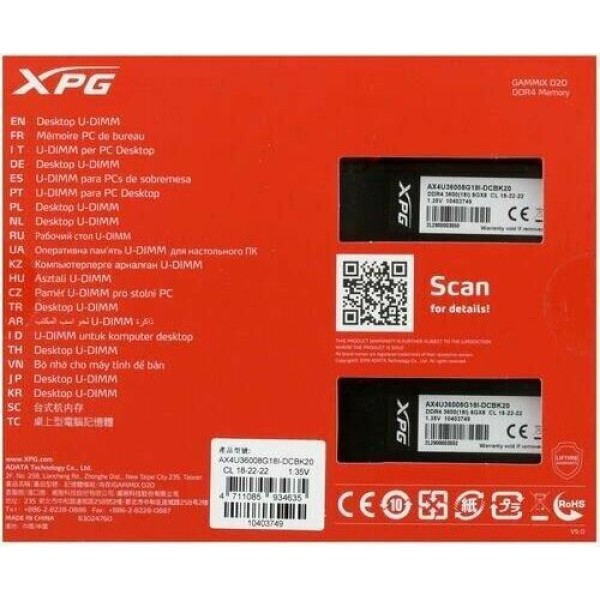 ADATA Модуль памяти DIMM DDR4-3600 16GB (8GBx2) AX4U36008G18I-DCBK20 A-DATA