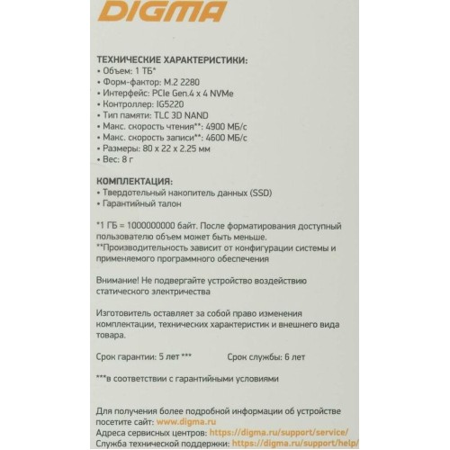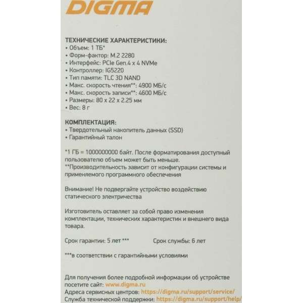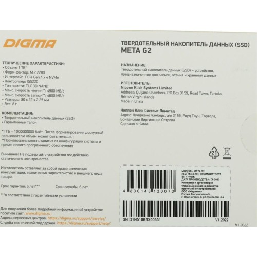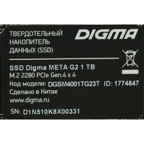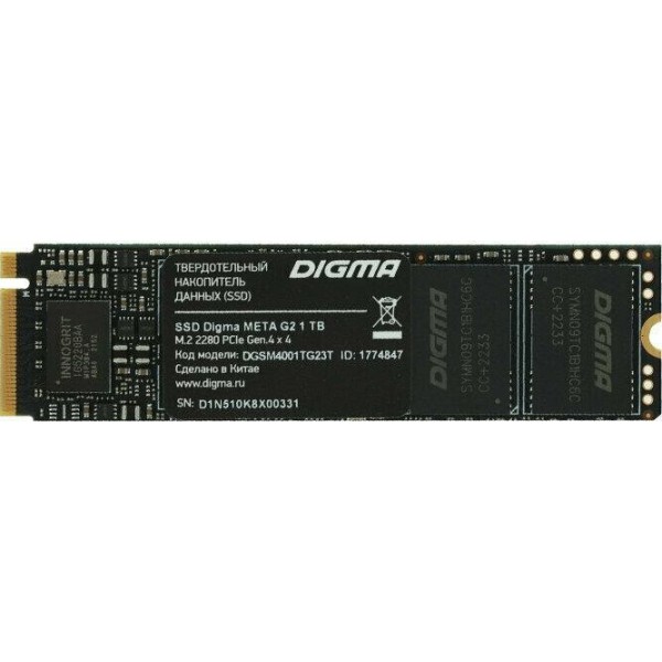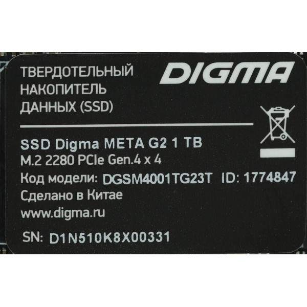 DIGMA SSD накопитель Meta G2 DGSM4001TG23T 1ТБ, M.2 2280, PCIe 4.0 x4, NVMe, M.2, rtl