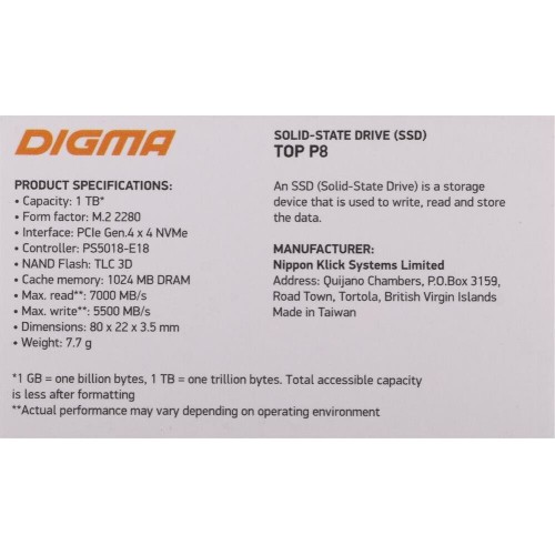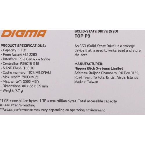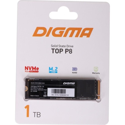 DIGMA SSD накопитель Top P8 DGST4001TP83T 1ТБ, M.2 2280, PCIe 4.0 x4, NVMe, M.2, rtl