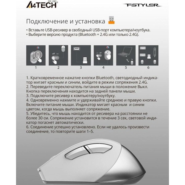 A4TECH Мышь беспроводная Fstyler FB35, Bluetooth/Радио, оптическая, USB, 2000dpi, белый и серый [fb35 icy white]