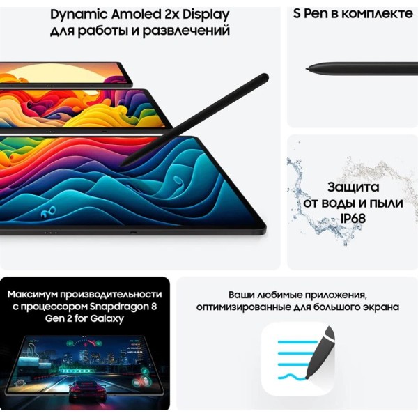 Количество стилусов - 1, Wi-Fi 802.11 a/b/g/n/ac/ax, Поддержка стандартов 3G/4G LTE/5G, да, степень защиты IP68, Разрешение видеосъемки 3840x2160 Пикс (4K), Поддержка GPS, Количество встроенных динамиков - 4, гироскоп, акселерометр, Цифровой компас