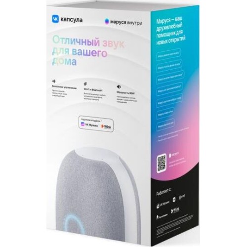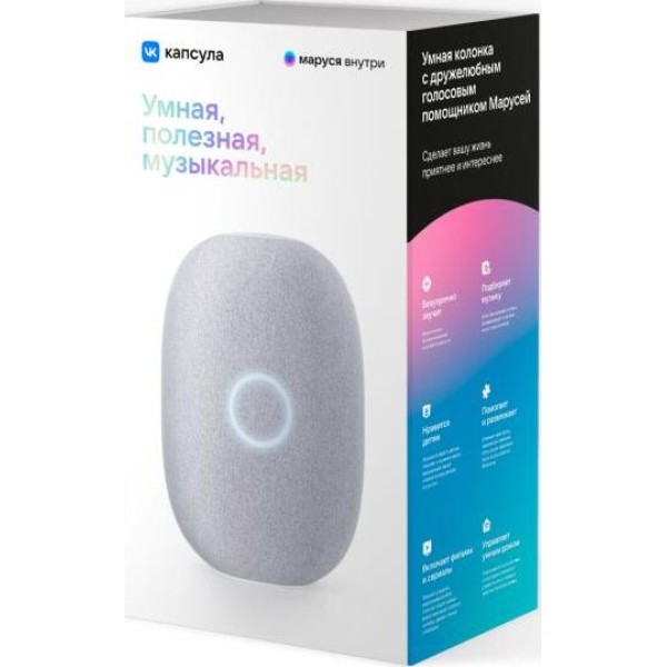 Материал корпуса: пластик, ткань. Влагозащищенный корпус: нет. Управление: сенсорное. Голосовой помощник: Маруся. Голосовое управление: да. Совместимость: Ростелеком, Умный дом Mail.ru. Технические характеристики Bluetooth: есть. Версия Bluetooth: 4.2. Суммарная мощность: 30 Вт. Частотный диапазон: 50 - 20000 Гц. Количество микрофонов: 6 шт. Поддержка потоковых аудиосервисов: есть. Выход HDMI: нет. Wi-Fi: есть. Отношение сигнал/шум: 80 дБ.
