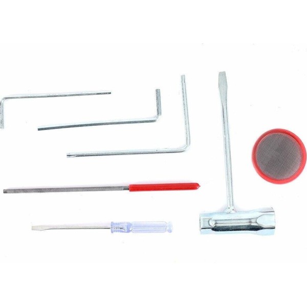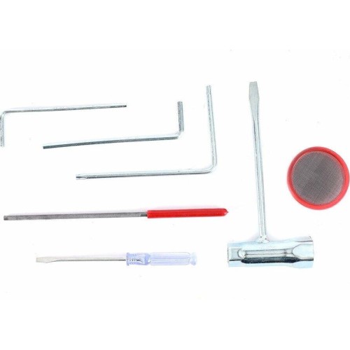 шина (OREGON- звездочка на 4-х заклепках), цепь (OREGON), напильник для заточки цепи, Емкость для приготовления смеси, воронка с топливным фильтром, набор инструментов для обслуживания