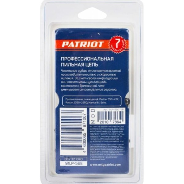 PATRIOT 862321040 91LP-56E, 3/8 1,3 56 звеньев, чизель, PROFESSIONAL (блистер) Шаг цепи, дюйм 3/8 (0.375) Количество звеньев 56 Длина шины (дюйм) 16 Длина шины (см) 41 Ширина паза (мм) 1.3