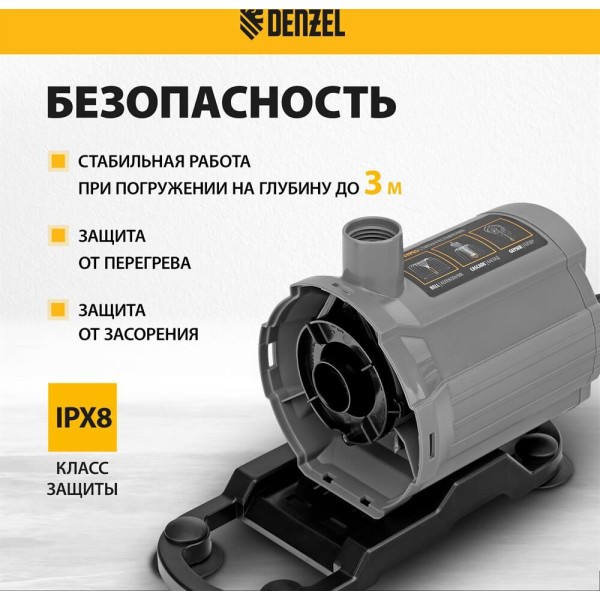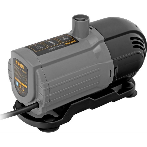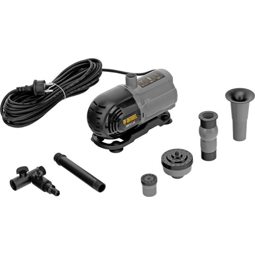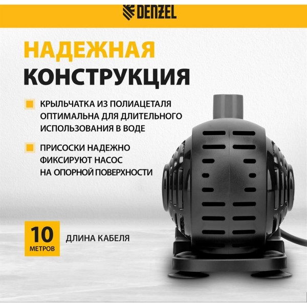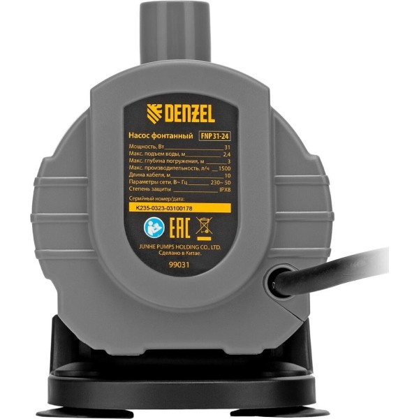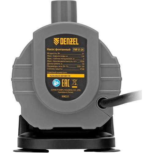 Фонтанный насос Denzel FNP3124 99031 мощностью 31 Вт, с насадками колокольчик/гейзер/каскад, перекачивает 1500 л воды в час и обеспечивает максимальную высоту подъема 2,4 м. Позволяет создать декоративный фонтан, украсив водоем и оживив ландшафт дачного участка. Установив одну из входящих в комплект насадок, можно получить наиболее подходящий тип струи: в виде колокольчика, гейзера, большого или малого каскада. Также в конструкции насоса предусмотрен специальный патрубок для создания водопада.ПреимуществаНадежность крыльчатка изготовлена из полиацеталя композитного материала, оптимального для длительного использования в воде.Устойчивость благодаря присоскам насос надежно фиксируется на опорной поверхности без риска опрокидывания.Защита от засорения губчатый фильтр препятствует попаданию частиц грязи в механизм.Термозащита в случае перегрева двигатель автоматически останавливается, что предотвращает его поломку.