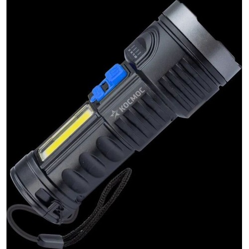 Аккумуляторный фонарь КОСМОС (KOS115Lit) с мощностью и свойствами прожектора в легком ручном корпусе. Умный индикатор показывает уровень заряда и во время подзарядки, и во время свечения. Совмещает луч фонаря (направленный свет) и широкий свет (освещает широкое пространство с одной стороны). Четыре режима работы: яркий, средний и мигающий у луча, и режим светильника. Литиевый аккумулятор. Источник света: мощный луч 3Вт LED; мощный боковой светильник 3Вт COB LED; Источник питания: Li-ion аккумулятор 18650 3,7В 1200 мА/ч (встроенный), индикатор уровня заряда, зарядный USB-шнур в комплекте; Количество режимов: 4 (яркий-экономичный-мигающий-боковой светильник); Световой поток: 120 лм. (луч)/130 лм. (широкий свет, боковой светильник); Дистанция освещения: 120 м. (луч)/17м2 (широкий свет, боковой светильник); Корпус: ABS-пластик (стилизация под металл); IP53; Размер: 14.6x5.6x5.6 см.; Ремешок ручной.