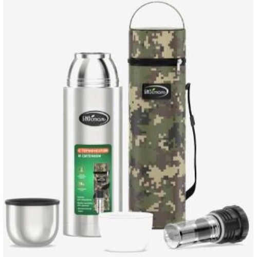 Термос из нержавеющей стали 18/8 (AISI 304) с ситечком для заваривания и пробкой-контейнером. Пробка с дополнительной изоляцией и функцией «термоконтроль» позволяет наливать напитки без полного откручивания пробки под любым углом. Ситечко из высококачественной нержавеющей стали 18/8. Дополнительная чашка из прочного пищевого пластика. Термочехол из прочной камуфляжной ткани защищает термос от повреждений и повышает его термозащиту.