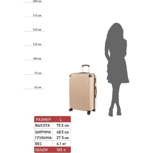 ОБЪЕМ ГЛАВНОГО ОТДЕЛЕНИЯ, Л. 100 МАКСИМАЛЬНАЯ НАГРУЗКА, КГ. 35 МАТЕРИАЛ КОРПУСА ABS пластик МАТЕРИАЛ ПОДКЛАДА полиэстер ТИП ЗАСТЕЖКИ молния КОДОВЫЙ ЗАМОК есть ЧИСЛО КОЛЕС 4 ВРАЩЕНИЕ КОЛЕС НА 360° есть РУЧКА алюминиевая телескопическая НАКЛАДНЫЕ РУЧКИ есть, 1 сверху и 1 сбоку ОСОБЕННОСТИ КОНСТРУКЦИИ дополнительный внутренний карман-сетка на молнии ЦЕЛЕВАЯ АУДИТОРИЯ мужчины и женщины ВЫСОТА, СМ. 75,5 ШИРИНА, СМ. 48,5 ГЛУБИНА, СМ. 27,5 ВЕС ЧЕМОДАНА, КГ. 4,1 СТРАНА-ИЗГОТОВИТЕЛЬ Китай