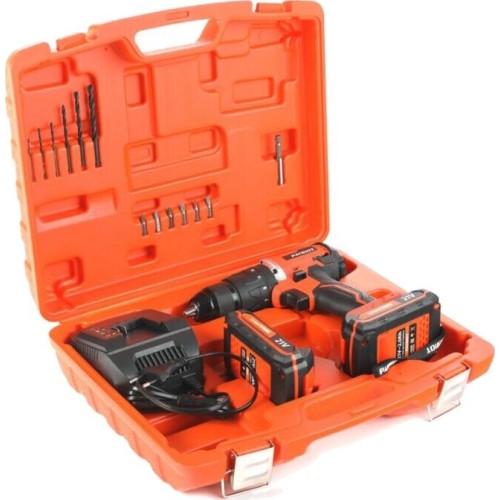 два аккумулятора, зарядное устройство, набор сверл и бит, кейс