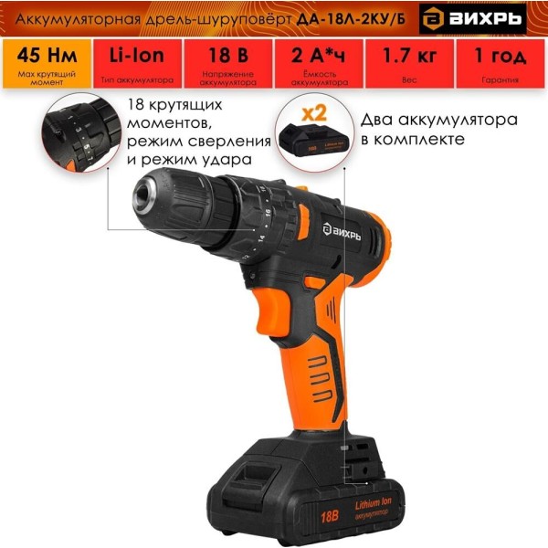 Дрель-шуруповерт ВИХРЬ ДА-18Л-2КУ/Б