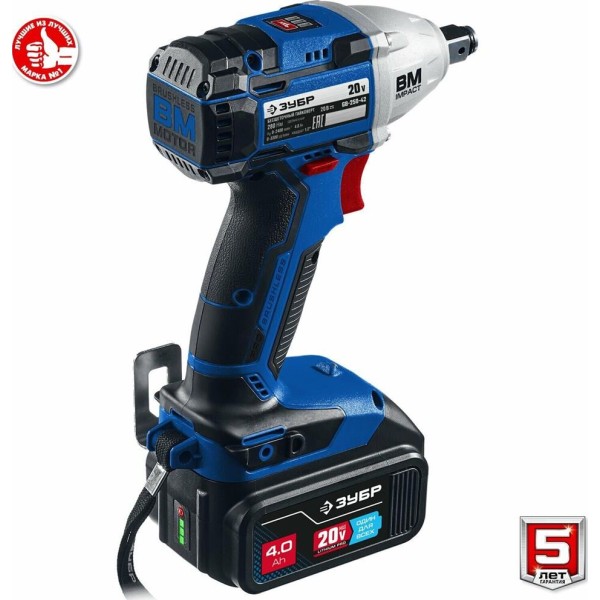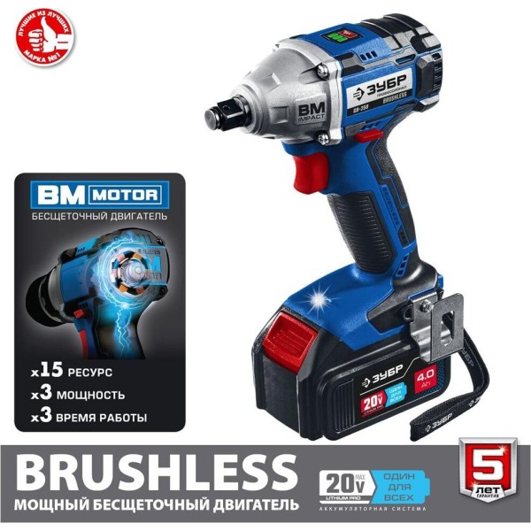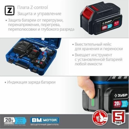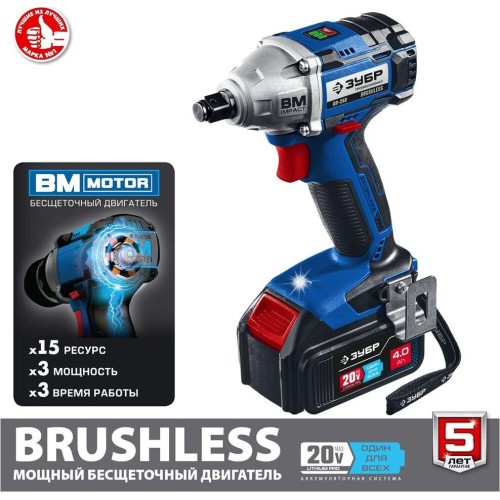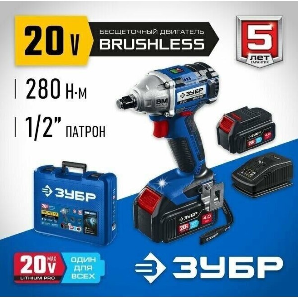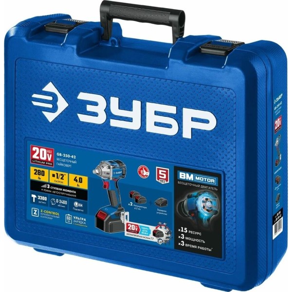 Бесщеточный гайковерт ЗУБР GB-250-42 20В бесщеточный гайковерт, 2 АКБ (4Ач), в кейсе, Профессионал