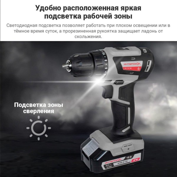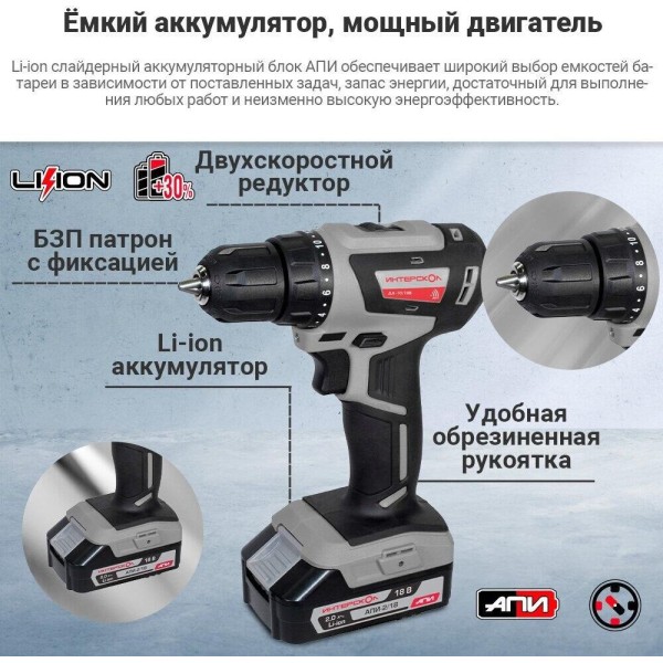 Дрель-шуруповерт ИНТЕРСКОЛ ДА-10/18В МиниМАКС бесщеточная аккумуляторная дрель-шуруповерт Li-ion АПИ (кейс, 2 аккум. 2Ач, ЗУ)