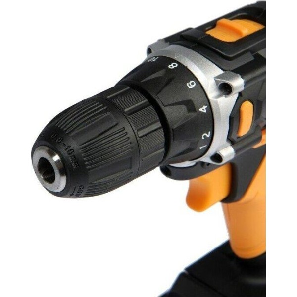 дрель аккумуляторная, аккумулятор - 2 шт, биты - 6шт, сверла - 6 шт, удлинитель бит, набор крепежа - 49 шт, зарядное устройство, кейс