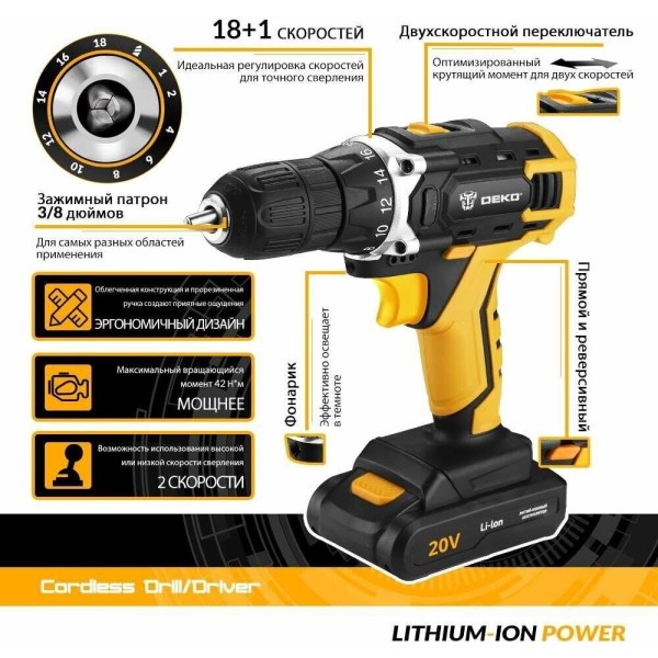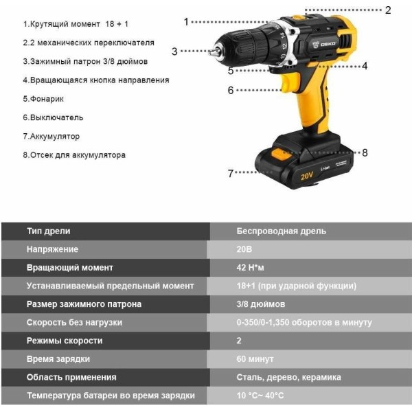 Тип аккумуляторный. Тип двигателя щеточный. Наличие реверса да. Наличие подсветки да. Тормоз двигателя нет. Тип патрона быстрозажимной. Крепление патрона 3/8. Блокировка шпинделя нет. Размер зажимаемой оснастки 1-10 мм. Max крутящий момент 42 Нм. Жестк. вращ. момент 42 Нм. Мягк.вращ. момент 42 Нм. Число скоростей 2. Частота вращения шпинделя 0-350/0-1350 об/мин. Max частота вращения шпинделя 1350 об/мин. Число ступеней крутящего момента 18+1. Max диаметр шурупа 6 мм. Max диаметр сверления (металл) 10 мм. Мах диаметр сверления (дерево) 28 мм. Тип аккумулятора Li-Ion. Напряжение аккумулятора 20 В. Емкость аккумулятора 2 А*ч. Устройство аккумулятора слайдер. Время заряда 2 ч. Количество аккумуляторов в комплекте 2. Зарядное устройство в комплекте есть. Габариты без упаковки 185х75х195 мм.