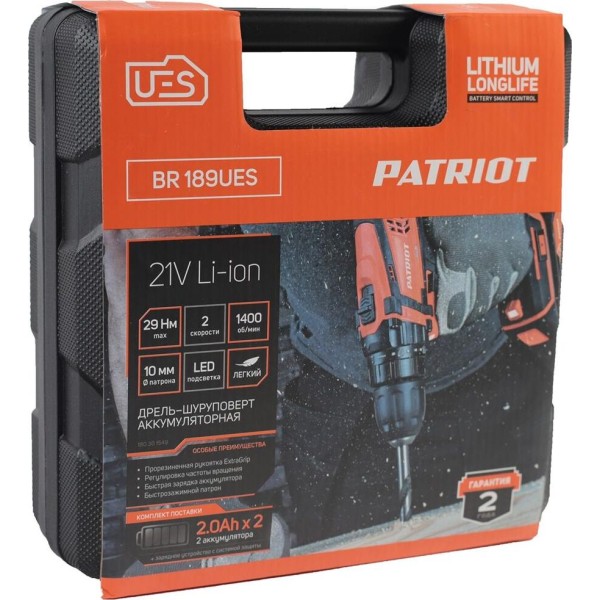Дрель PATRIOT 180301549 Дрель-шуруповерт аккумуляторная BR 189UES, две АКБ Li-Ion 18В, 2,0 Ач, 29Нм, 2 скорости, кейс