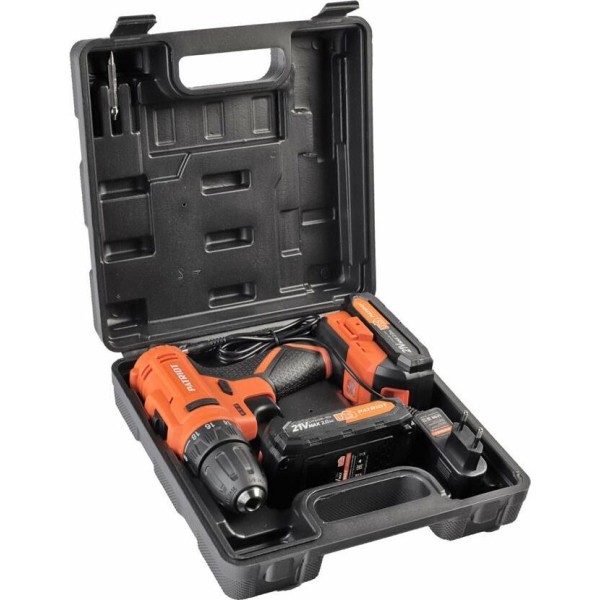 дрель-шуруповерт аккумуляторная, аккумуляторная батарея 2 шт., зарядное устройство, пластиковый кейс, инструкция по эксплуатации