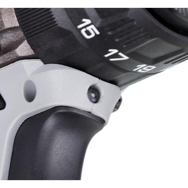 Кейс в комплекте, Рукоятки с резиновым покрытием, индикатор заряда аккумулятора, фиксация шпинделя, ограничитель глубины сверления, лампа точечной подсветки, блокировка кнопки включения, тормоз двигателя