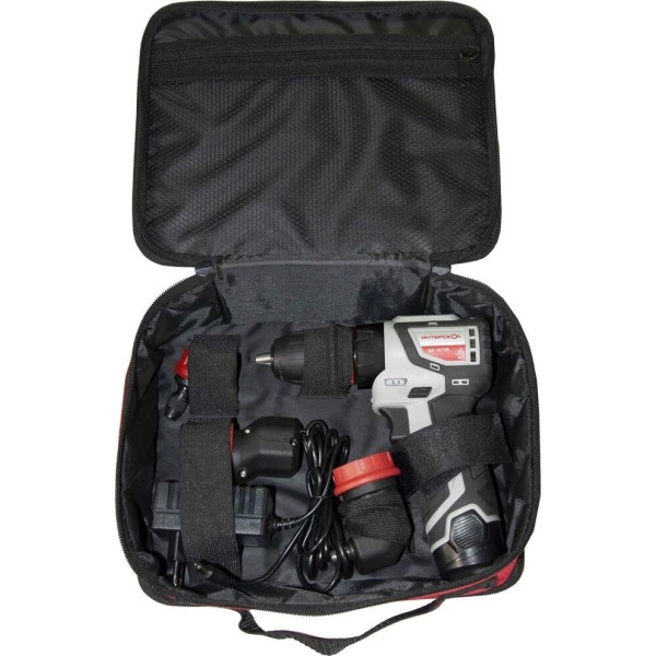 2 аккумулятора, патрон, эксцентриковая насадка, зарядное устройство, угловая насадка, HEX насадка, сумка