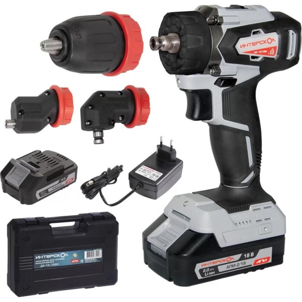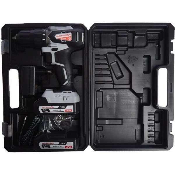 Аккумуляторный блок АПИ-2,0/18И 2шт, Скоба 1шт, Угловая насадка 1шт, Часовое моноблочное зарядное устройство 2шт, Дрель-шуруповерт 1шт, Кейс пластмассовый 1шт, Трехкулачковый патрон БЗП 1шт, Руководство по эксплуатации 1шт, Эксцентриковая насадка 1шт.