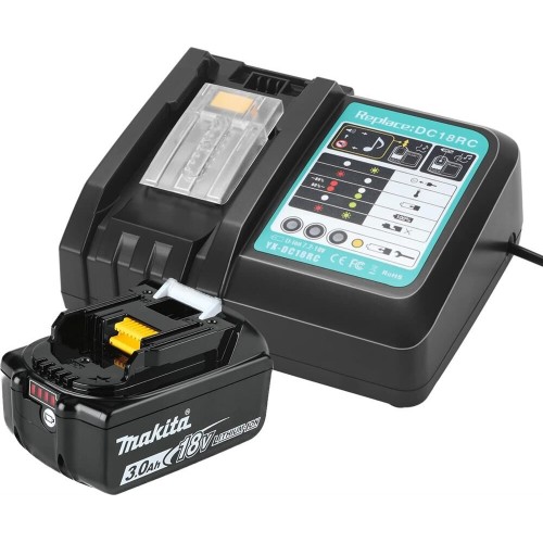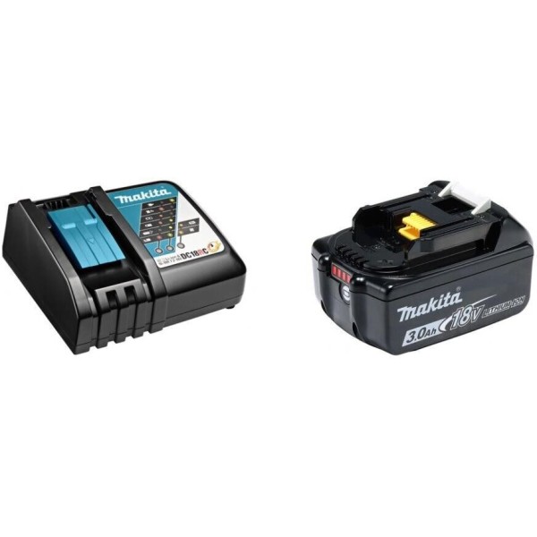 комплектация: зарядное устройство DC18RC; 1 аккумулятор BL1830B; время зарядки 22 минуты; индикатор уровня заряда