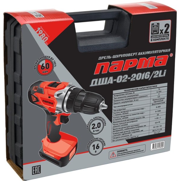 ПАРМА Дрель-шуруповерт ДША-02-2016/2Li, 2Ач, с двумя аккумуляторами [02.021.00015]