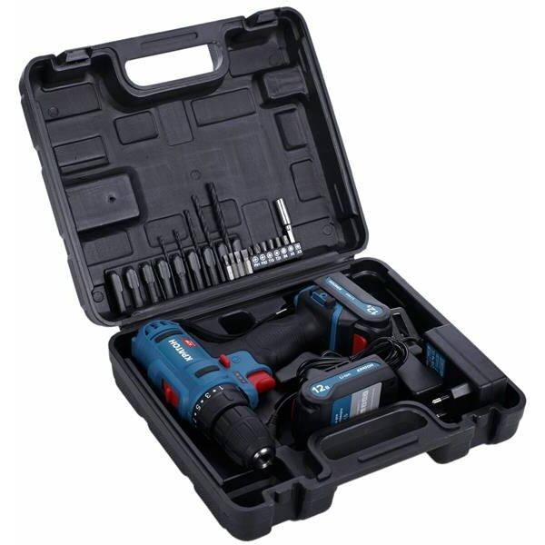 12 В, 3; 4; 5; 6; PH1; H2; T15; T20; H4; H5 - 10 шт. 7. Скоба - 1 шт. 8. Винт М3 × 10 - 1 шт. 9. Гайка М3 - 1 шт. 10. Кейс - 1 шт., 25 мм, L = 60 мм - 1 шт. 6. CR-V биты (насадки отверточные), 1,5 А·ч - 2 шт. 4. Сверло HSS Ø 1,5; 2,5; 3; 4; 5; 6 мм - 6 шт. 5. Держатель бит магнитный, 1. Дрель-шуруповерт - 1 шт. 2. Зарядное устройство - 1 шт. 3. Батарея аккумуляторная Li-ion