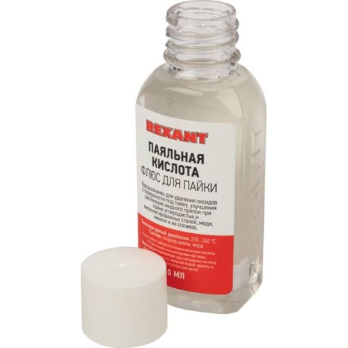 Флюс для пайки паяльная кислота 30 мл REXANT предназначен для удаления оксидов с поверхности под пайку, улучшения растекания жидкого припоя при пайке углеродистых и низколегированных сталей, меди, никеля и их сплавов. Это одно из самых распространенных средств для пайки.