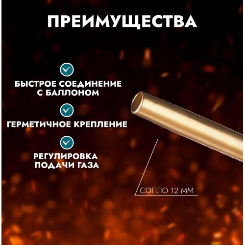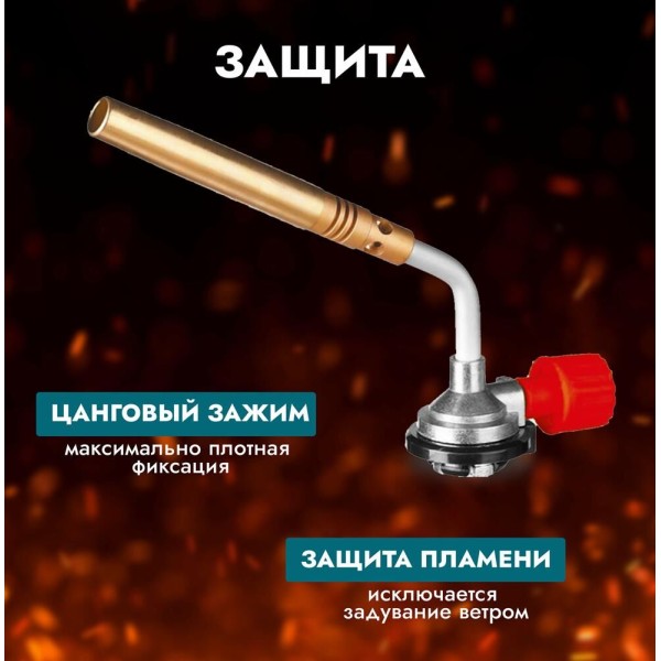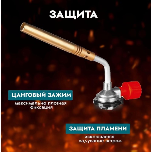 Газовая горелка обеспечивает выполнение широкого спектра работ: сварка, пайка, нагрев. Применяется в автомобильных мастерских, сервисах, походах, бытовой сфере. Благодаря цанговому зажиму горелка максимально плотно фиксируется на баллоне. Предусмотрена защита пламени от задувания ветром. Применение продукта: Сварка, бытовые предназначения Тип соединения: Цанговое Тип включения: Ручной Температура пламени: 1300°C Топливо: Газ Расход газа: 120 г/час (максимальный) Тепловая мощность: 1,65 кВт (максимальная) Материал: Металл, пластик Диаметр сопла: 12 мм Инструкция по эксплуатации: Плотно присоедините горелку к газовому баллону. Отрегулируйте подачу газа с помощью крана. Затем поднесите источник возгорания к соплу. После окончания работы поверните кран по часовой стрелке до упора и отсоедините баллон. Не направлять горелку с пламенем на конечности и лицо, а также в сторону легко воспламеняющихся предметов. Храните в недоступном для детей месте.
