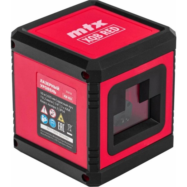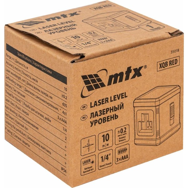 Лазерный уровень MTX XQB RED Basic SET 35018 с красным лучом, резьбой под штатив 1/4?, в комплекте с 3 батарейками ААА, проецирует на поверхность горизонтальную и вертикальную линии (крест) дальностью до 10 м. Незаменим при выполнении ремонтно-строительных работ в помещениях, подходит для бытового применения.ПреимуществаНадежность и долговечность — корпус дополнен специальными прорезиненными гранями, демпфирующими при падении лазерного уровня.Функция самовыравнивания — неровность поверхности автоматически компенсируется в диапазоне 4° ± 1°.Безопасная транспортировка — функция блокировки маятника обеспечивает его сохранность (при выключении питания маятник блокируется автоматически).Возможность фиксации на штатив — нивелир имеет резьбу 1/4?, установка позволяет избежать его смещения при выполнении измерений и работать в одиночку (штатив приобретается отдельно).Компактность — небольшие габариты 70 х 70 х 75 мм позволяют с удобством разместить инструмент в сумке или рюкзаке и брать его с собой на выездные работы.