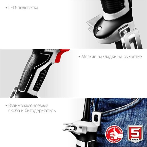 быстрозажимной патрон,электронная защита от перегрузок, предохранительная муфта, подсветка, регулировка частоты вращения, реверс, Защита от перегрузок