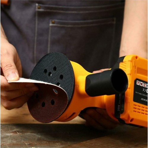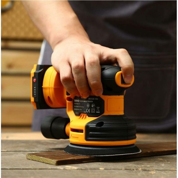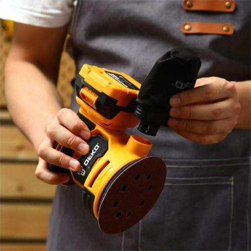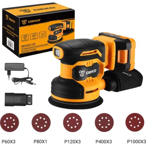 зарядное устройство (1 шт.), шлифмашина эксцентриковая аккумуляторная DEKO DKCG20-125 (1 шт.), шлифовальные круги (5 шт.), пылесборник (1 шт.), патрубок для подключения пылесоса (1 шт.), аккумулятор (1 шт.)