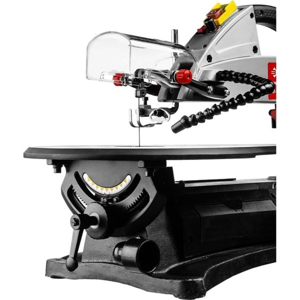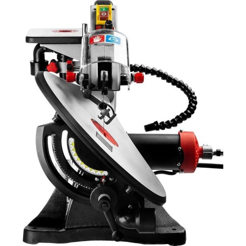 Универсальный станок для всех распиловочных работ: продольного, а также фигурного, Наклонный распил/рез, Гибкий вал с приводом для выполнения сверлильных, Быстрозажимное крепление, подсветка, маятниковый ход, шлифовальных и гравировальных работ, наклонного, косого и комбинированного пиления, Электромагнитный выключатель